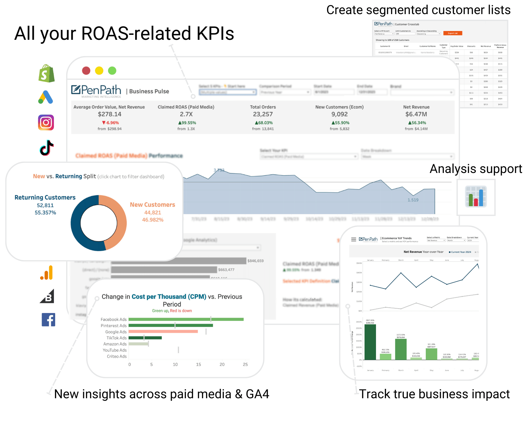 Access complex metrics: ROAS / MER, Net Sales, CAC, AOV, True Conversion Rate, Cost/Session, And countless more…